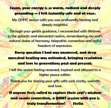 Susan guides her clients, empowering them with tools to tune into their own intuition and helping them clear out the old ways making space and expansion for their bright future.